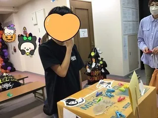 おやつくじは紐で吊るしたお菓子が箱に入っていて洗濯ばさみで止めてあり、洗濯ばさみを外すとおやつが落ちるシステムです。まず、おやつくじを引く順番を決めるくじ作りを行います。順番を決めるくじは、折り紙です。好きな折り紙を折って自分の名前を書きます。袋に入れて、職員が引いた人が一番にくじを引きます。くじを引いたお友だちが次のくじを引いて順番を決めていきます。自分たちでくじを作る楽しみと、「何が当たるのか?」わくわくしながらくじを引く楽しみを味わうのが目的です。