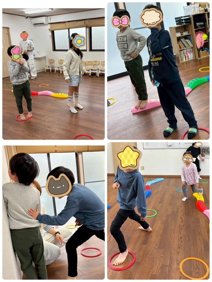 平均台をそーっと歩き、バランスを取りながら「だるまさんが転んだ!」の声でしっかりと止まる、たくさんのカラーフープの中でピッ!と止まるなど少し変わっただるまさんが転んだで体をたっぷり動かしました🥳