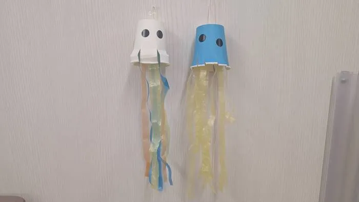 さまざまな色のスズランテープを使ってくらげらしさを表現し、とっても上手に作ってくれました!