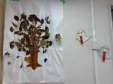 スタッフがあらかじめ用意しておいた落ち葉を使って、大きな木を作りました♪