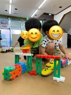 誘われた友達も「いいよ!」と笑顔で加わり、 2人で力を合わせて大きな車庫とコースを完成させることができました。