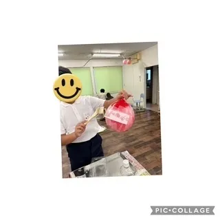 風船を膨らまして、ハケでのりづけし、半紙を丁寧にはっていきます。