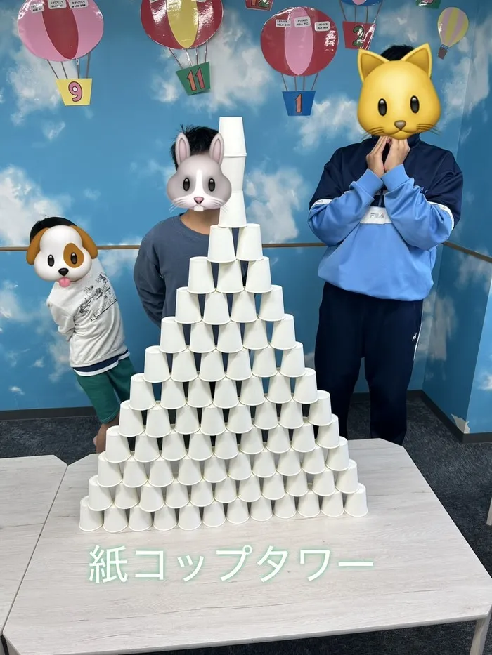 今日のレクリエーションは紙コップタワー!!