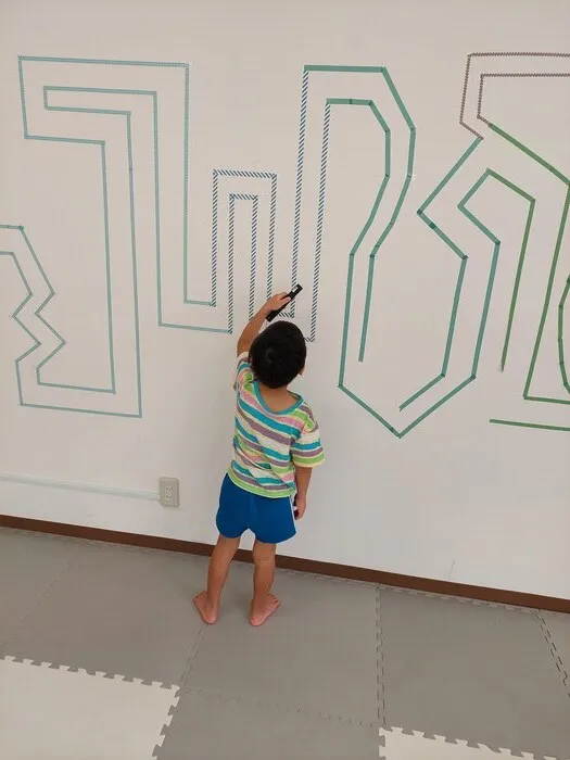 離れて目視した後は近くから目視し、楽しみながら目と手の協調性を高めています✨大きな迷路をクリアすることで達成感が得られ、集中して取り組みました😉