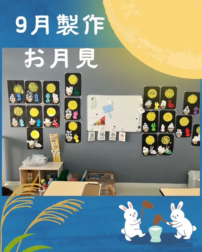 お団子は絵の具で筆を使って描く子、ティッシュを丸めて貼る子、とそれぞれに合わせてすすめました。ウサギは折り紙で折れる子は折ってみましたよ✨