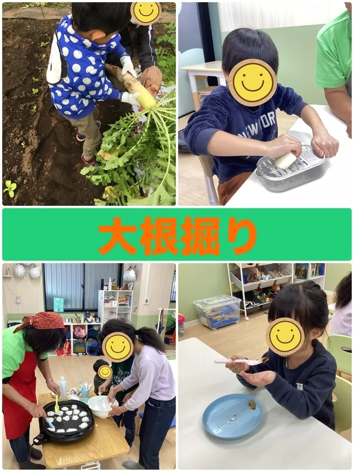 午前は、近くの農家さん(日野市石坂ファームさん)の畑で「大根掘り」を行いました。子どもたちは、畑の土を一生懸命に掘って大根を掘り出しました。昼食後に、午後は大根を使った「大根もち」を作りました。まずは、大根おろしを作って、醬油と砂糖で味付けして、片栗粉で固めて…。「大根もち」は、おやつの時間に試食しました。
