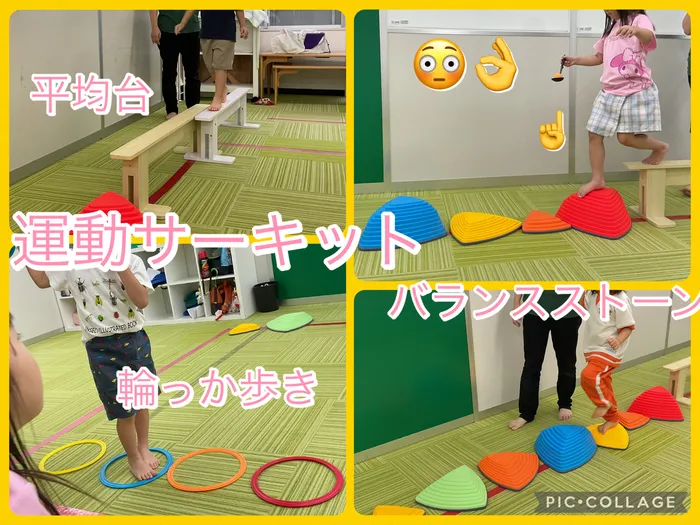 平均台、バランスストーン、マット、輪っかを使い、身体操作力とバランス感覚を養う活動です✨