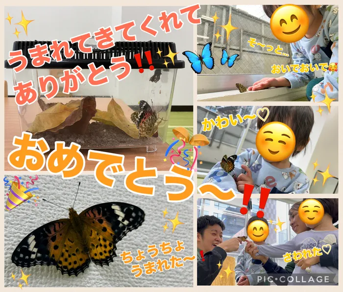 うまれたばかりの綺麗な羽を、飼育ケースの中でパタパタと動かし、飛ぶ練習をしていました🥹子ども達と一緒にたくさん観察して、手で触れてみました✨蛹からうまれてきた、不思議さをたくさん感じましたよ。
