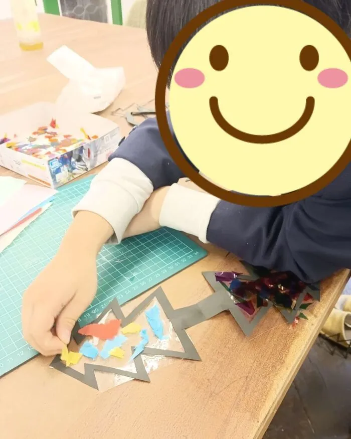 テープを貼ったツリー型の台紙に色セロハンや色紙などを散りばめて幻想的で色鮮やかなツリーをみんなクリスマスのプレゼントやご馳走などの話をしながら目を輝かせて作っていました😊