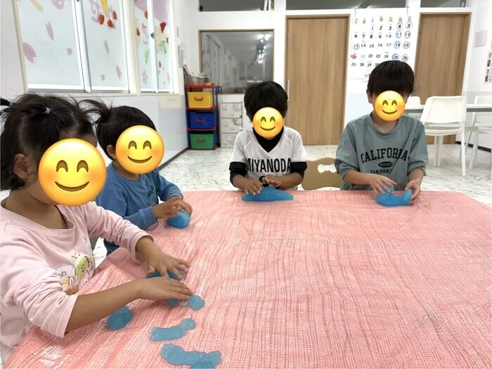 感触を確かめながら「ぷにぷにしてる~!「冷たくて気持ちいい!」と大盛り上がりでした✨出来上がったスライムを見せ合いながら笑顔が沢山見られ楽しい時間になりました。✨