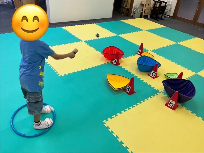 得点が書かれたコーンの隣にあるカゴに入れる活動です✨