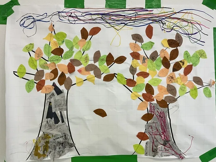 先日、静かな活動で大きな紙に描かれた木に児童自身が糊付けして貼り付ける。という活動を行い、その続きで雲☁️を描く・木に色をつけよう。という活動をしました。