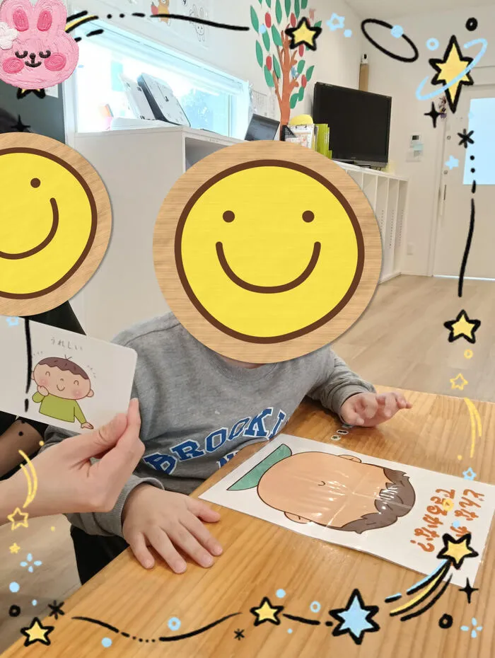 絵合わせの他に同じ感情の表情を各パーツごとに顔の上に置いてみたり、数字を言いながら数字ハメをしたりしました✨