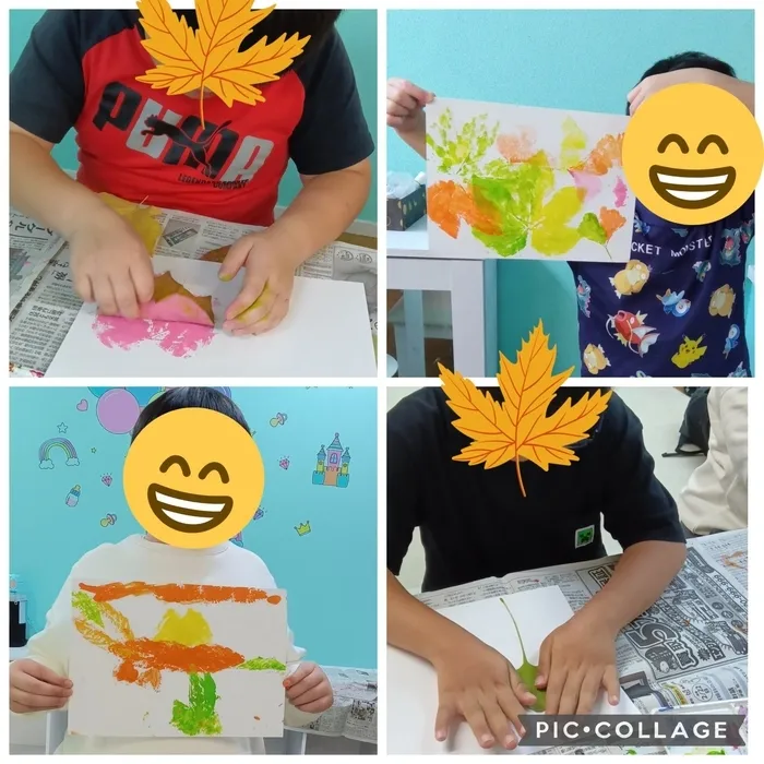いろいろな葉っぱの形、色を使ってカラフルな作品をつくる子や、恐竜などの形になるように工夫した作品をつくる子など、個性あふれる素敵な作品が出来上がりました🥰