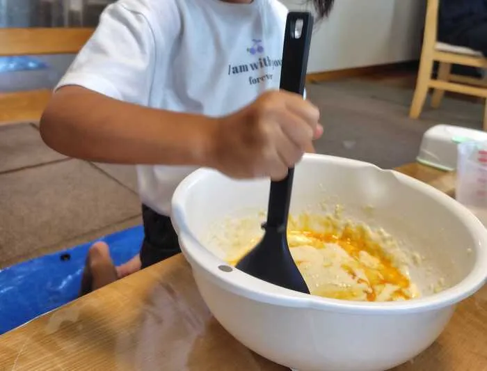 ボールにお好み焼き粉と卵を入れたら、ぐるぐる混ぜて・・・卵も割ってボールの中へ。みんな上手に卵を割り入れることができました🍳キャベツやお肉を入れたら、さらに混ぜて・・・生地の完成!!ホットプレートで焼くと・・・ふっくらおいしいお好み焼きができました(*^-^*)