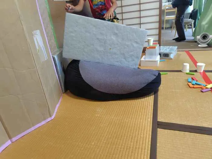 段ボールのパーテーションや発泡スチロールのブロック、大きなクッションなどを使いました!自分で考えた秘密基地に、お友達を誘って楽しく遊びました♬