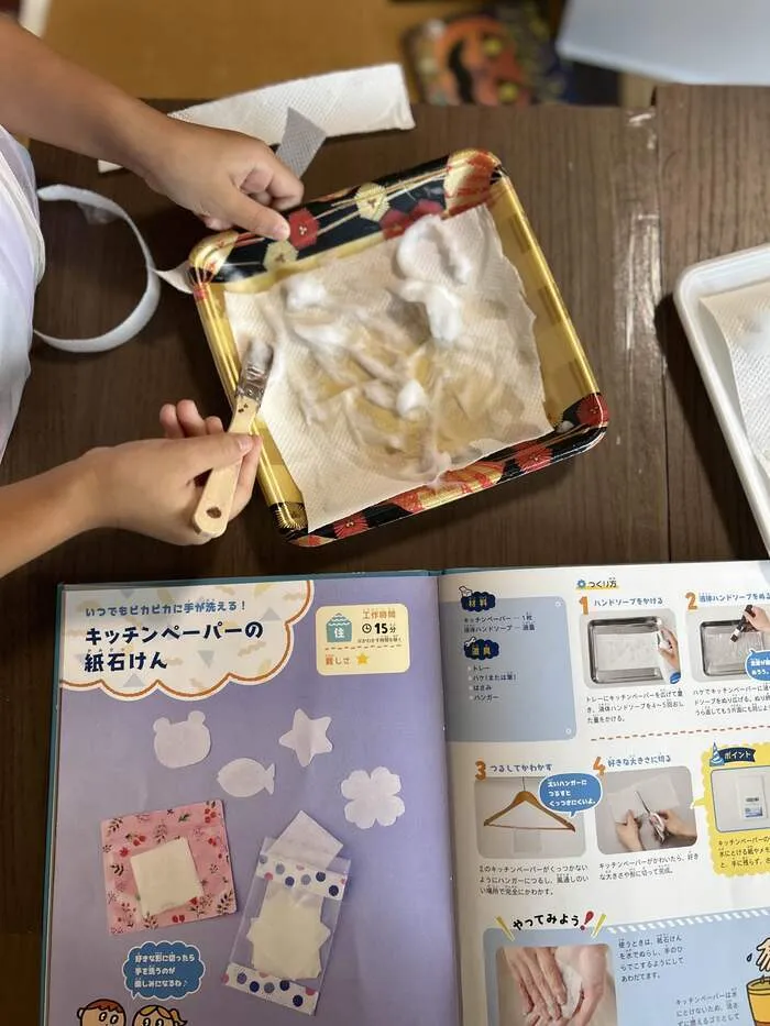 キッチンペーパーに液体ハンドソープをかけてかわかすと、キッチンペーパーの紙せっけんの完成です✨