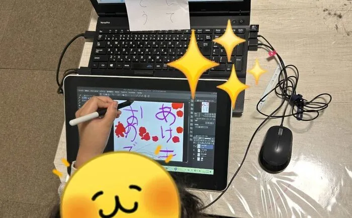 液晶タブレットを使って作成した子どもは、好きな色やソフトの機能も使いながら、とても可愛らしい年賀状を作成することができました😊✨