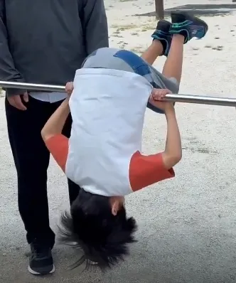 そこで、まずは鉄棒にタオルを巻いて、痛くならないようクッション代わりに。すると簡単に登れるようになりました。そこから頭を下げてぶらさがり、逆さまになる練習です。「怖い」と言いつつも、5秒、10秒と時間を伸ばし、逆さになるのにも慣れてきました。一人でぶらさがれるようになったら、いよいよ大人が補助(プロンプト)しながら回ってみます。