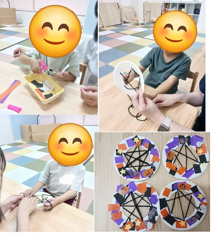 紙皿に紐を通し、自分たちで切った折り紙を貼って、かぼちゃやお化けを貼ってハロウィン飾りを作りました。