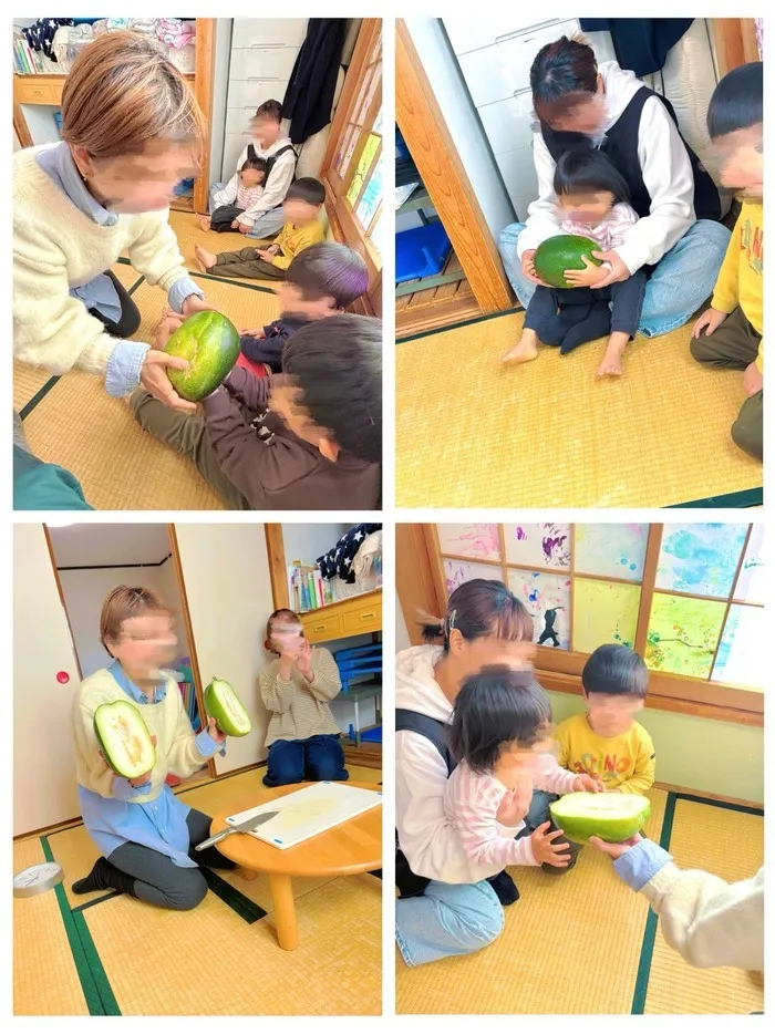 朝の会では、いただき物の冬瓜とピーナッツ(バターナッツ)カボチャをみんなで見ました🎃