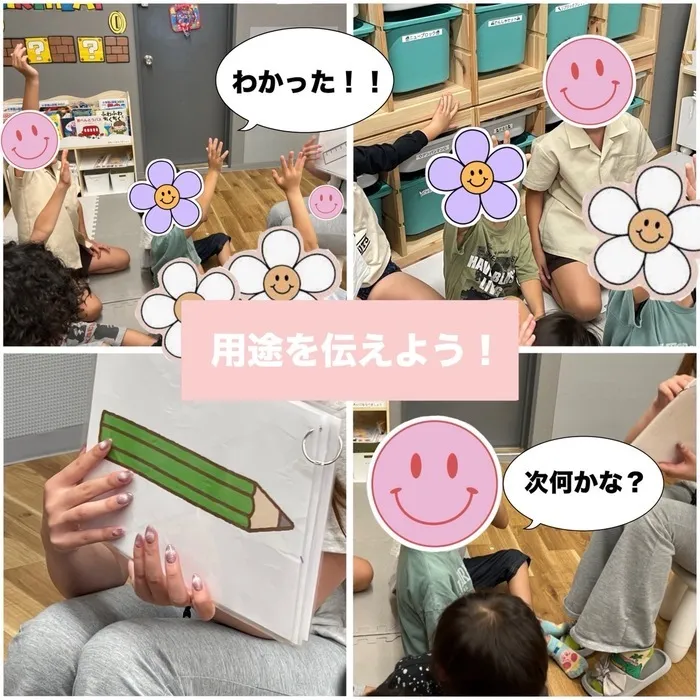 道具や物が描かれてるカードを見て、どんなことに使うのかやどんな場面で使われるのかなど、関連するものを答えました💡