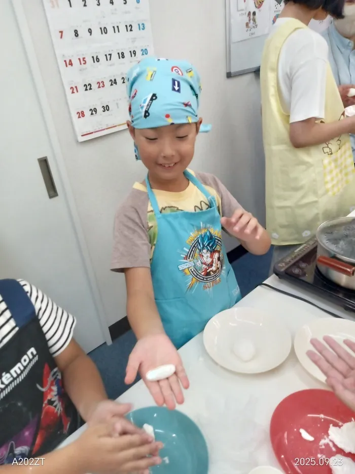 みんなで材料を購入するところから始まり、わくわくしながらのお買い物でした。お団子には何が必要なのかも確認し、グループに分かれての作業でした。粉の分量と水の量と混ぜながら手のひらの力が弱いお友だちは少し苦戦していましたがこれも経験をすることで力加減がわかってくるというねらいもありつつのお団子つくりでした。