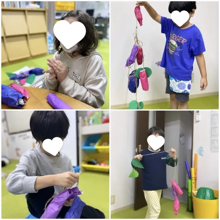 次に、サツマイモの制作活動に取り組んでいます。新聞を丸め紫色の画用紙(筒状)に詰める工程では、スピーディーに新聞紙を丸めたくさんのサツマイモを作る子どもたち。筒の大きさによって、丸める新聞紙の大きさや中に入れる数が異なることにも気づき、「これは大きいからたくさん詰めないと」と言いながらサツマイモを作りました🍠