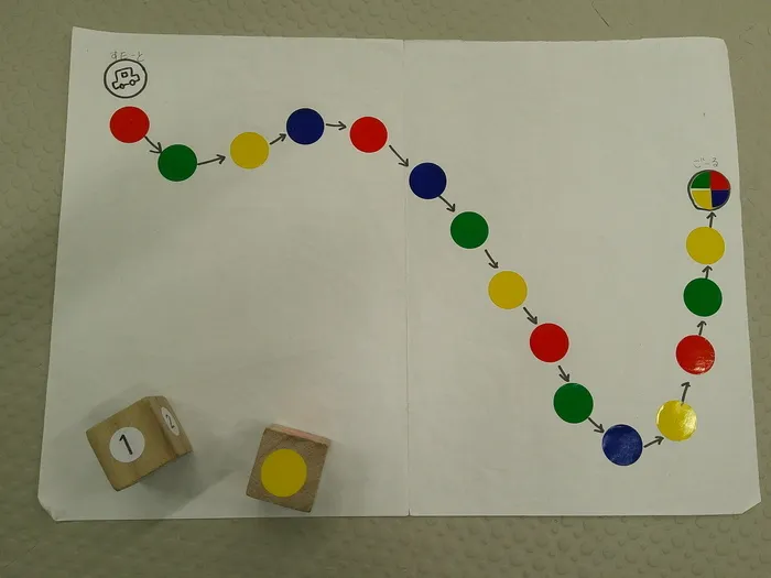 最初は画像のような色しかついていないサイコロ・色のマス目を使い、「サイコロの出た目に注目する」練習をします。