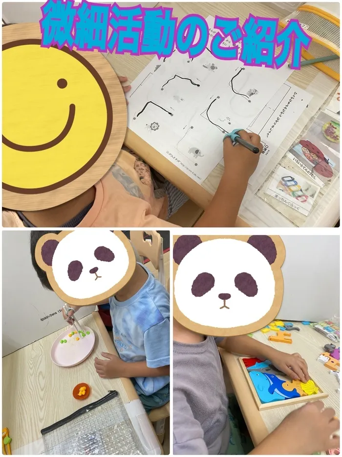 この活動は、なぞり書きやひらがな、数字の練習などをプリントで練習しています!プリント以外にも、お箸の使い方の練習や指先の細かいコントロールの練習を行なっています😄