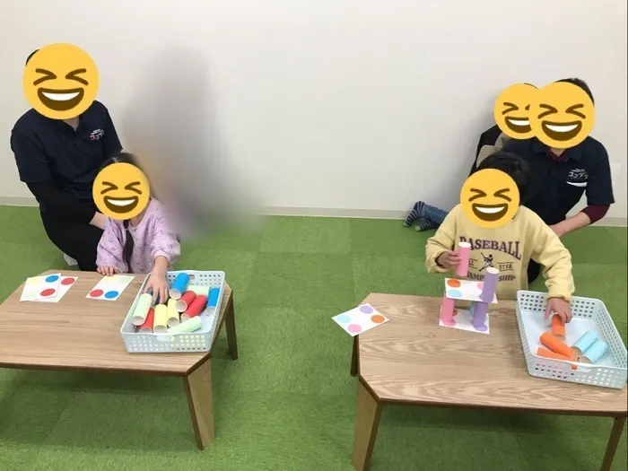 4色の丸がかかれたカードの色の組み合わせ通りに棒を立てていきます🙌
