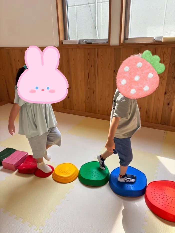 音楽に合わせてバランスストーンやブロックの上を歩きました😊
