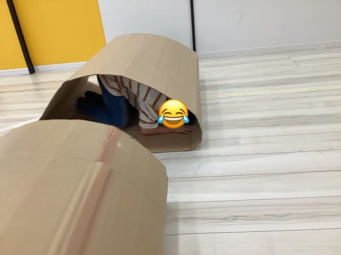大きな段ボールをトンネル状にしてその中に入り、体を丸めてハイハイして進んでいく遊びです。