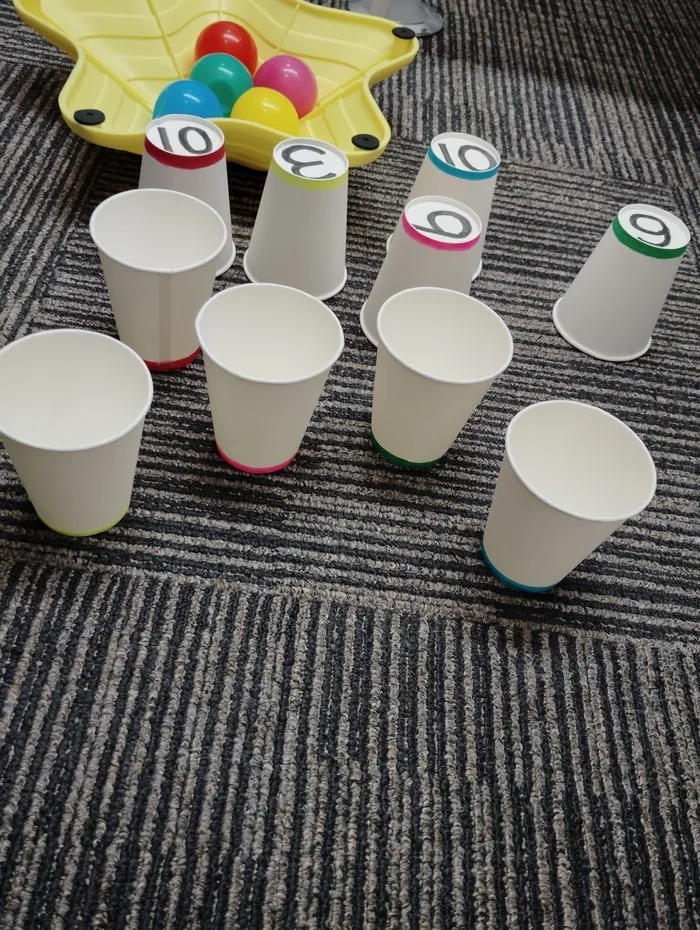 まず、紙コップをまばらに置いてカラーボールを当てる事を目標としました。