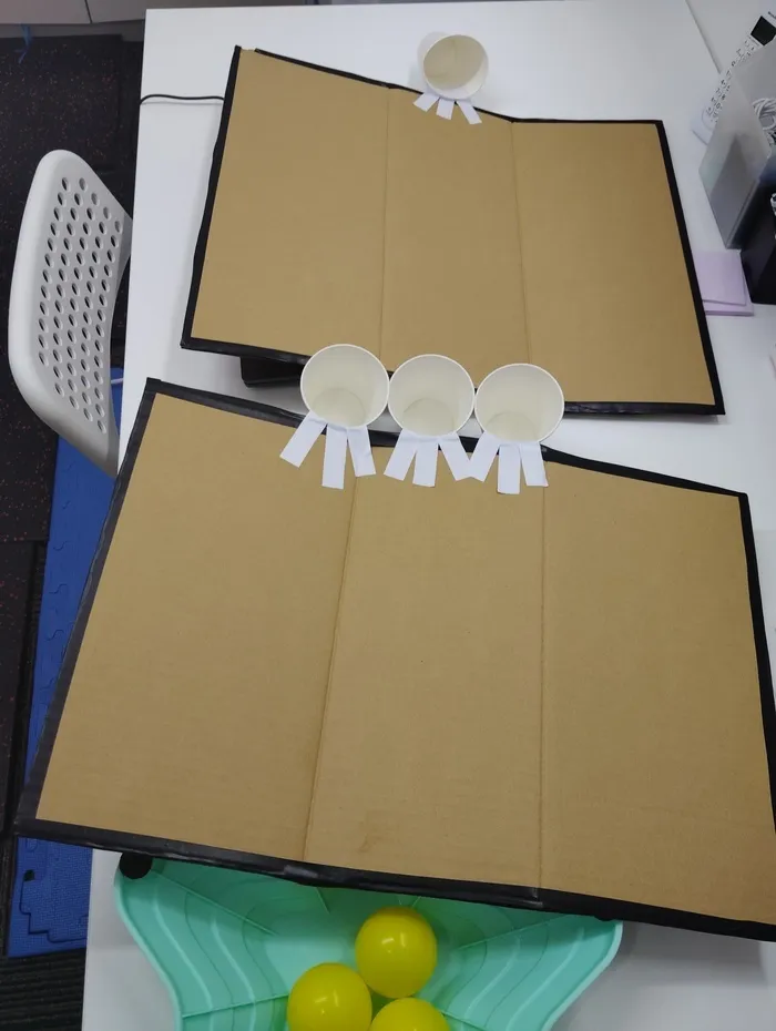 ②段ボールの端の真ん中あたりにボールが入るように紙コップをテープで止める。