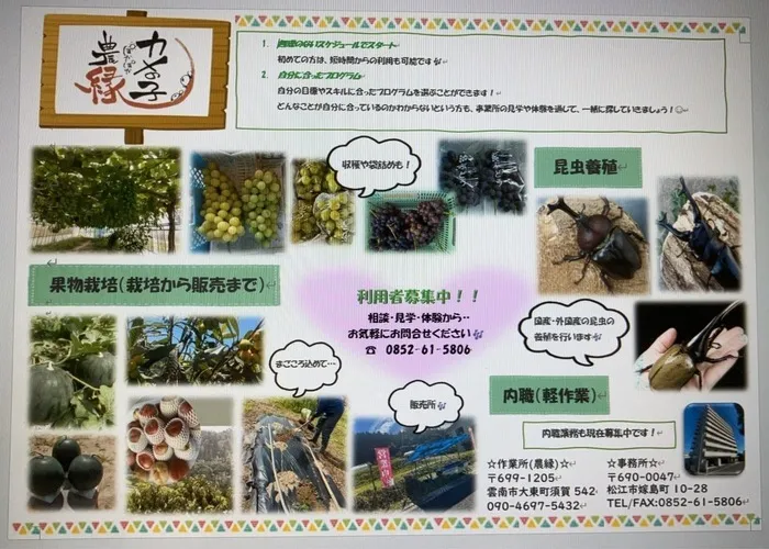 カメの子では、幼児さんから成人までの一貫した支援をめざして、日々研鑽をしております。今回、放課後等デイサービスを卒業された方々から、その後についてのご相談が相次ぎ、就労継続支援B型「カメの子ぽかぽか農縁」を立ち上げる事になりました。ついては、パートでお手伝いをして頂ける方を募集しております。ほんのちょっとのスキマ時間を利用して広々とした自然の中で働いてみませんか?