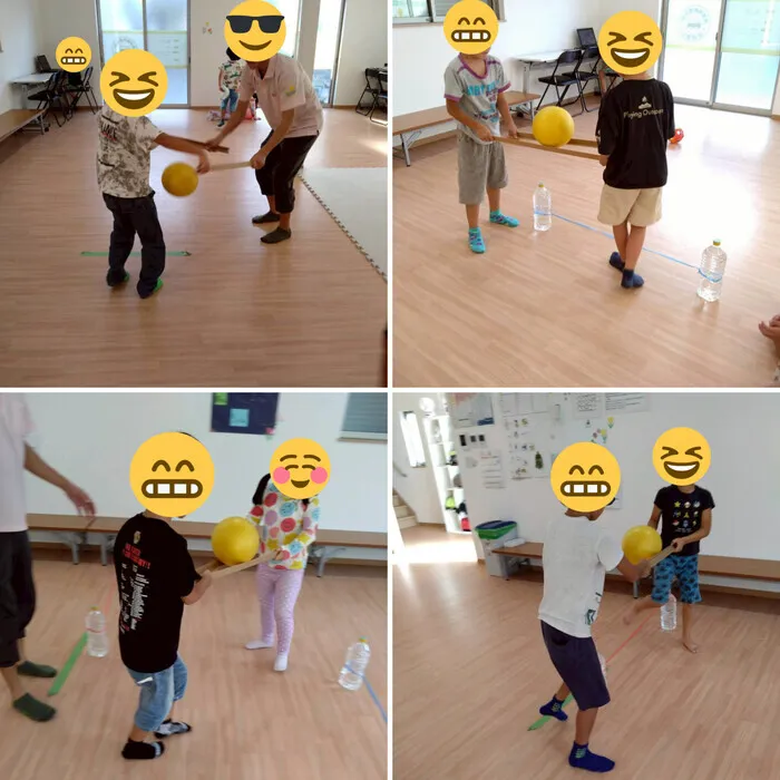 2人ペアになり棒を持ってその上にボールを置き施設を1周しました。