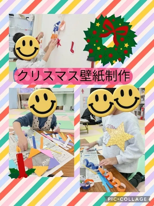 輪飾りやリース、クリスマスツリー等様々な制作を楽しみ、最後は出来上がった作品を壁紙に貼ってニコニコ笑顔でしたよ♬