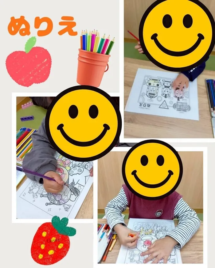 子どもたちは塗り絵を始めると、しっかり座って、とても集中して思い思いに楽しんでいます🎶