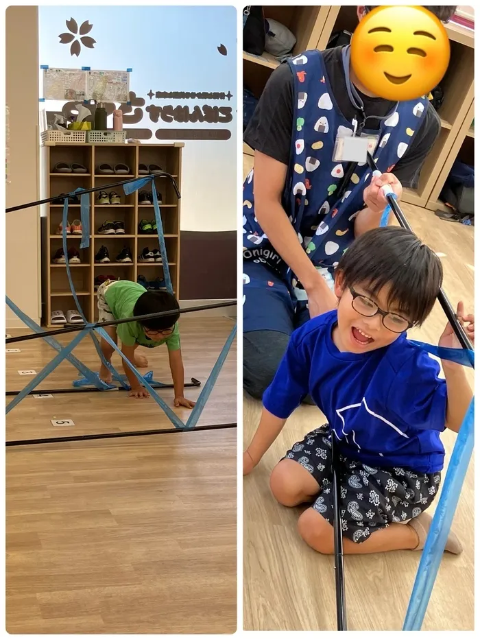 スズランテープを蜘蛛の巣に見立てて当たらないように通り抜けました。子どもたちはとても意欲的で頑張るぞ!と意気込む姿が見られました🎀