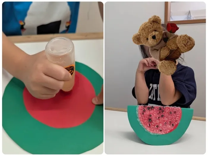 画用紙にのりを塗ったり、スイカの種をマジックで塗ってみたり・・・
