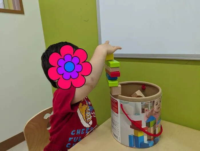 先日、強化子で積み木をもって個室に入ったお友だちがいたのですが、丸い入れ物の淵に上手に積み木を積み重ねている姿が・・・