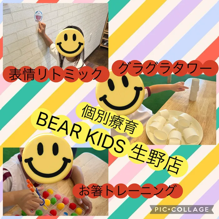 タワーが倒れないようにそ〜っと積み上げて集中力アップ👀💪 お箸の練習では、指先をしっかり使ってビーズをつまむことに挑戦👏 リトミックでは「うれしい😆」「かなしい😢」などの表情を音楽に合わせてまねっこ🎶