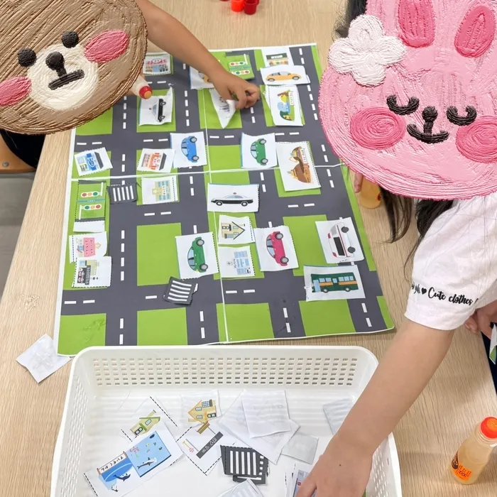 チームに分かれて協力して施設パーツを切り、話し合いながら街を作りました!