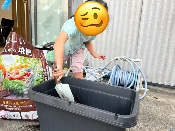 土を混ぜて…指先で穴を作って種を優しく入れて…土のお布団を被せて…と真剣に取り組む子ども達。