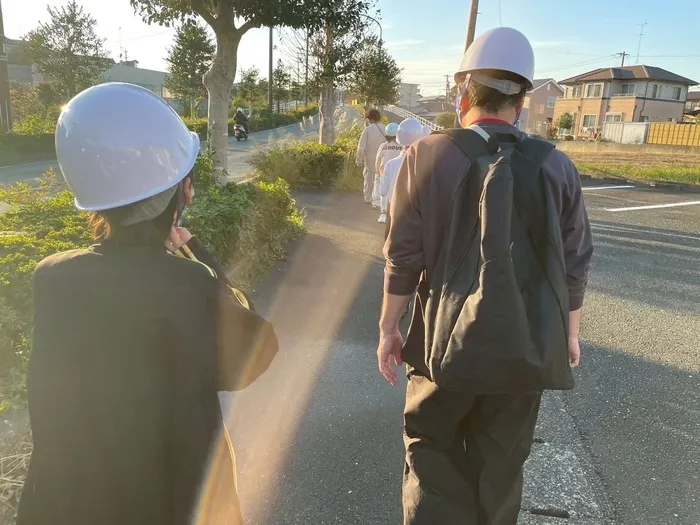 ヘルメットを被って交通ルールを守りながら子ども達なりに避難することが出来ました。「地震があると木も倒れるかもね…」「道路も崩れるかも…?」と一緒に考える時間も用いることが出来ました。