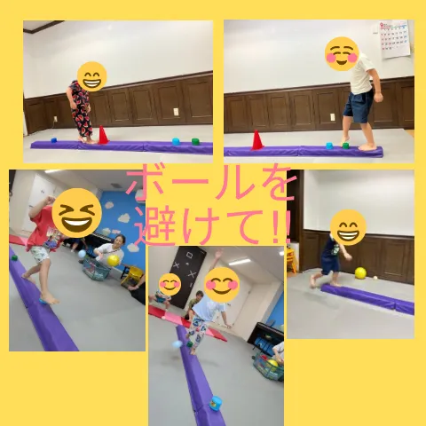 平均台を渡りながら、横から飛んでくるカラーボールを避けるのは中々難しい様で進まない子どもたち🤣🤣