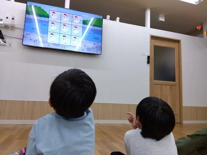 設定活動の内容はモニターに表示されているマスの中にイラストが描かれており、その一つだけ違うイラストが紛れています。あとから動物の大群が押し寄せてきて、一部色のマスに変わります。