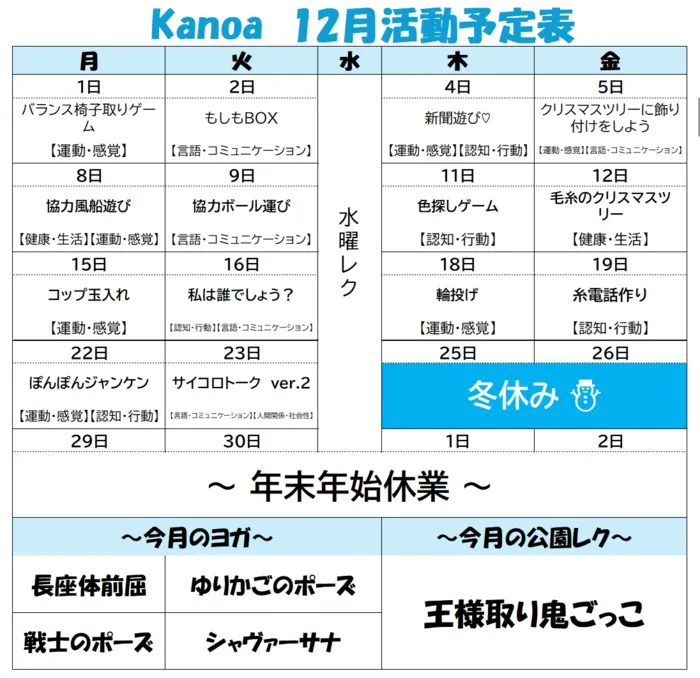 12月は、クリスマス工作や季節の制作、元気に体を動かす運動遊びを予定しています!