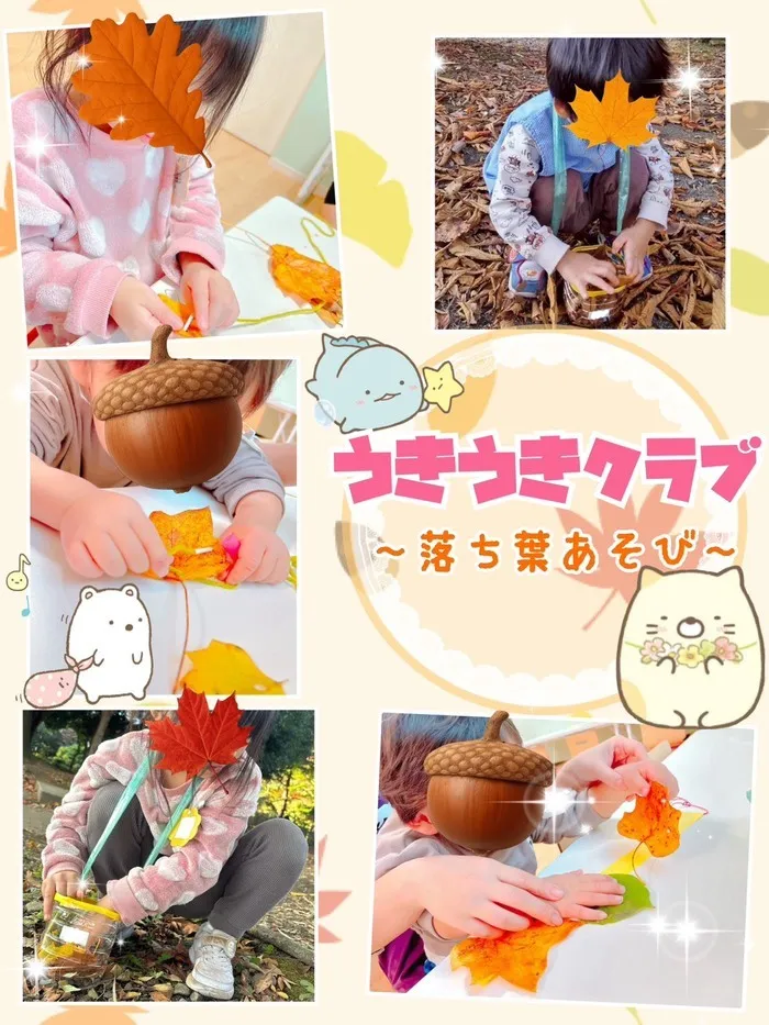 集めた落ち葉を使い、指先で調整しながら紐に通したり、バランスを考えながらペタペタと貼ったりしました😊
